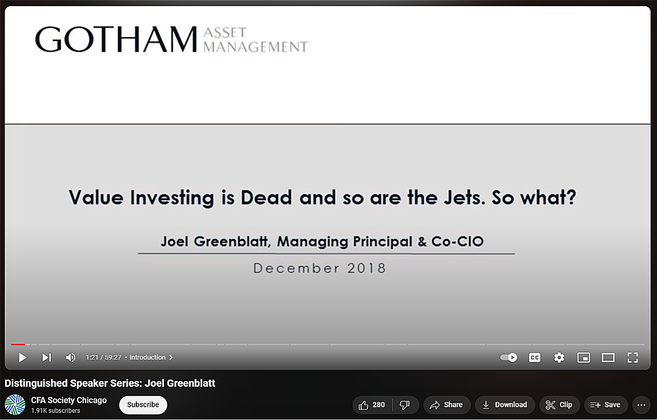 Consider this: Picture a teenager out there who is trying to understand what investing truly means. There are likely millions of people who fit that profile. A resourceful teenager would, in all likelihood, come across most of these Greenblatt videos. As of this writing, the Greenblatt/Marks video has 131K views. The CNBC video where he talks about his definition of value investing has 51K views. Even this last one where Greenblatt characterized himself as a value investor has 17K views. Part 1 of the Finance Simplified podcast? 4.6K views. Part 2 which includes his most direct denunciation of value investing? 1.8K views. One doesn’t have to be a math genius or social media influencer to conclude that if Greenblatt’s true view is that value investing is a myth, which we are pretty sure it is, that opinion will likely NOT reach the public. Instead, our hypothetical teenager will be converted to the religion of value investing, further perpetuating the myth.