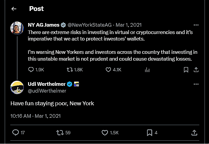 Enter, “have fun staying poor,” which is often used to deride people who are critical of Bitcoin, like this Tweet exchange from 2021: