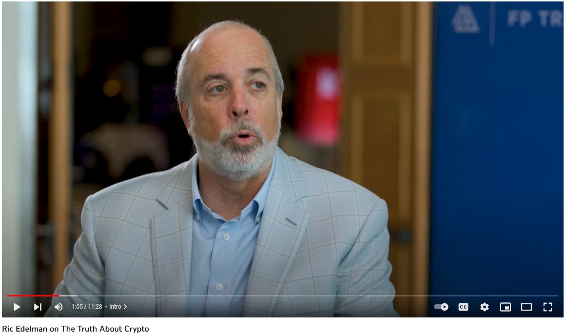 You know where you want to take your research next; a focus on other people that are smart and have gained society’s trust. You turn your attention to personal finance experts. Surely, some of them must have formulated some opinions on Bitcoin, and more generally crypto. One of the biggest names in the industry is Ric Edelman, and yes, he does have some opinions on crypto...