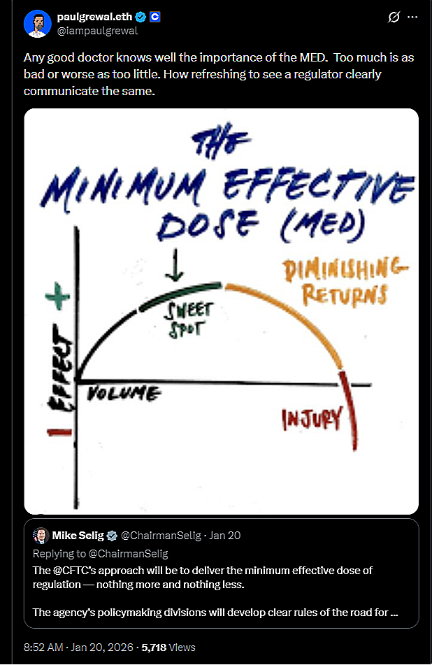 Sounds eerily similar to the minimum effective dose of regulation approach the CFTC is adopting.