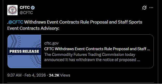 Meanwhile, the CFTC–after sitting on the sidelines not for a year but for seven–has reemerged not as a cautious steward, but as an active proponent of sports gambling. The proposed 2024 rulemaking on event contacts and the staff advisory are now officially gone:
