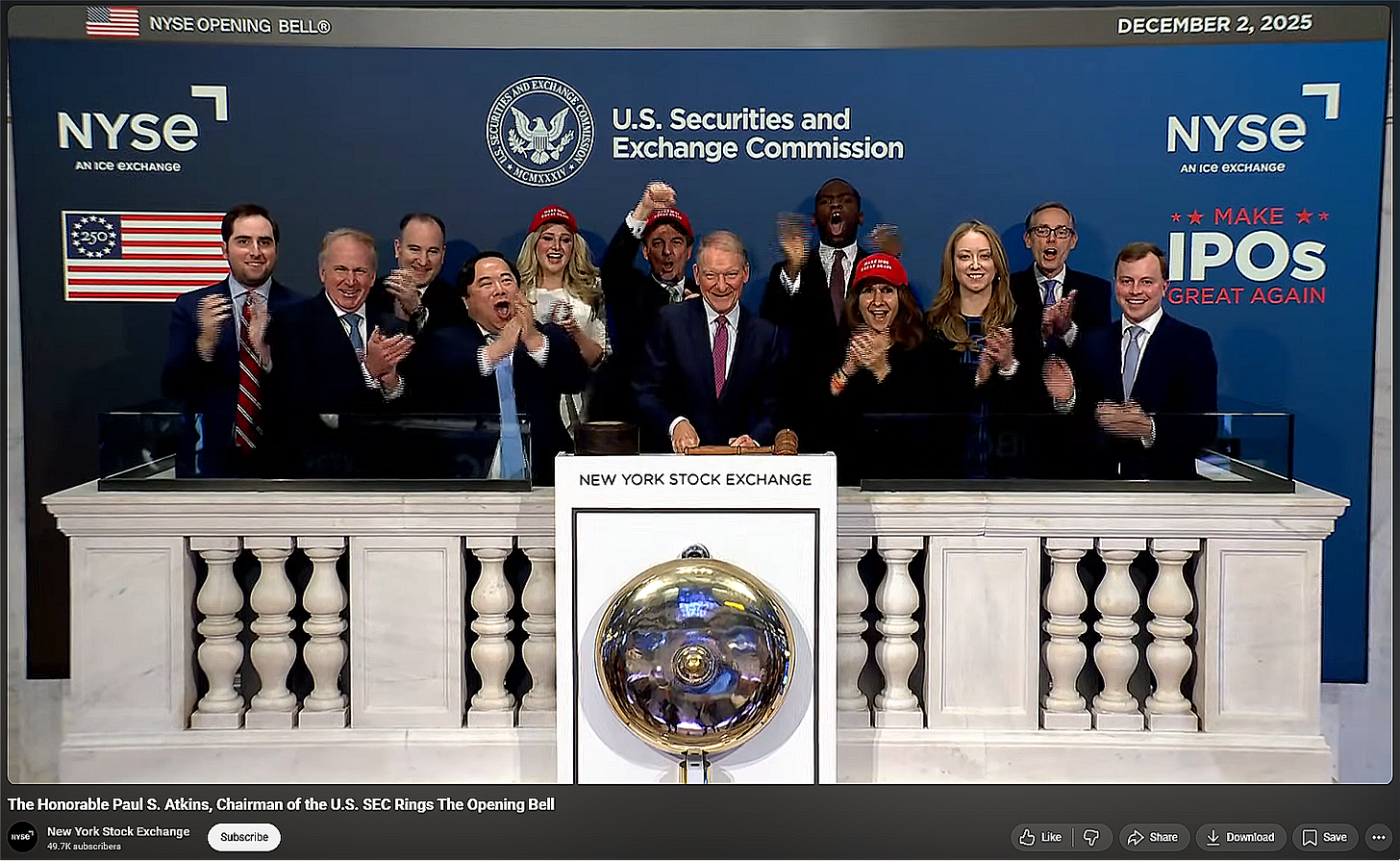 He also delivered a speech titled Revitalizing America’s Markets at 250 (video of full speech, written remarks). In his speech, Atkins tied America’s success directly to investing:
