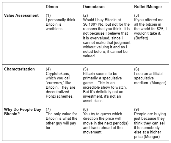 When comparing your three subjects, you begin to see some similarities between Dimon, Damoradan, and Buffett/Munger when comparing their views on Bitcoin. Time to hit the whiteboard again: