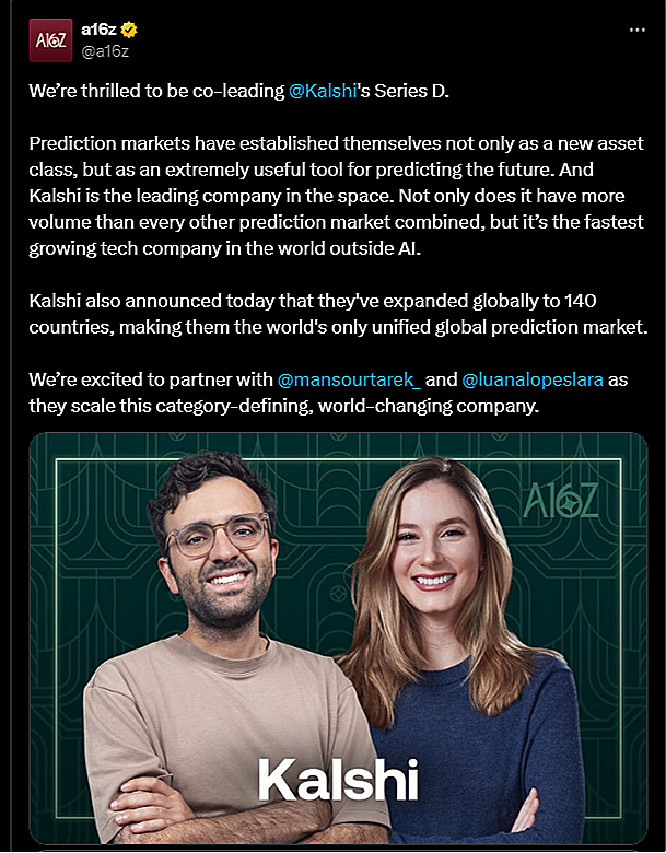 First, Kalshi secured a $300 million Series D investment led by Sequoia and a16z, valuing the company at $5 billion. Kalshi also announced plans to go international, expanding its offering to more than 140 countries and is now the largest prediction market in the world.