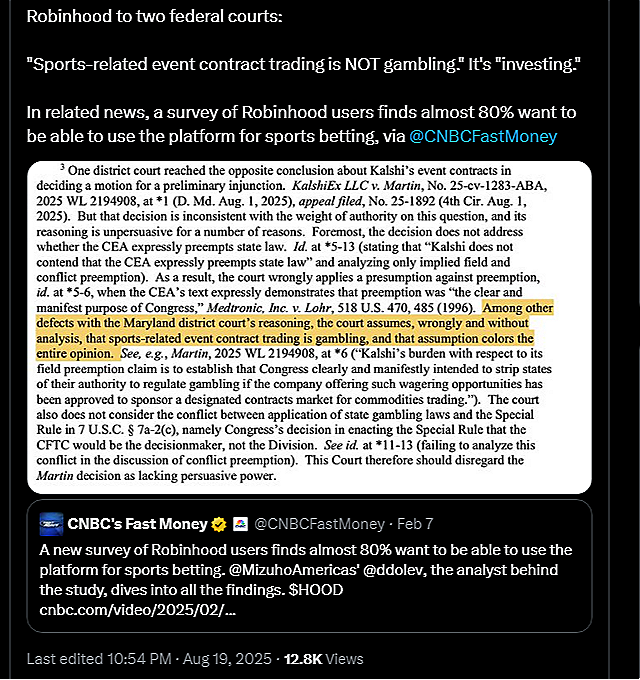 Strange, isn’t it? A senior journalist at a respectable magazine puts out a misleading headline. You can chalk it up to clickbait. But the words ‘prediction markets,’ ‘betting,’ ‘Robinhood’ and ‘lawsuits’ already make a strong headline; nothing else is needed.