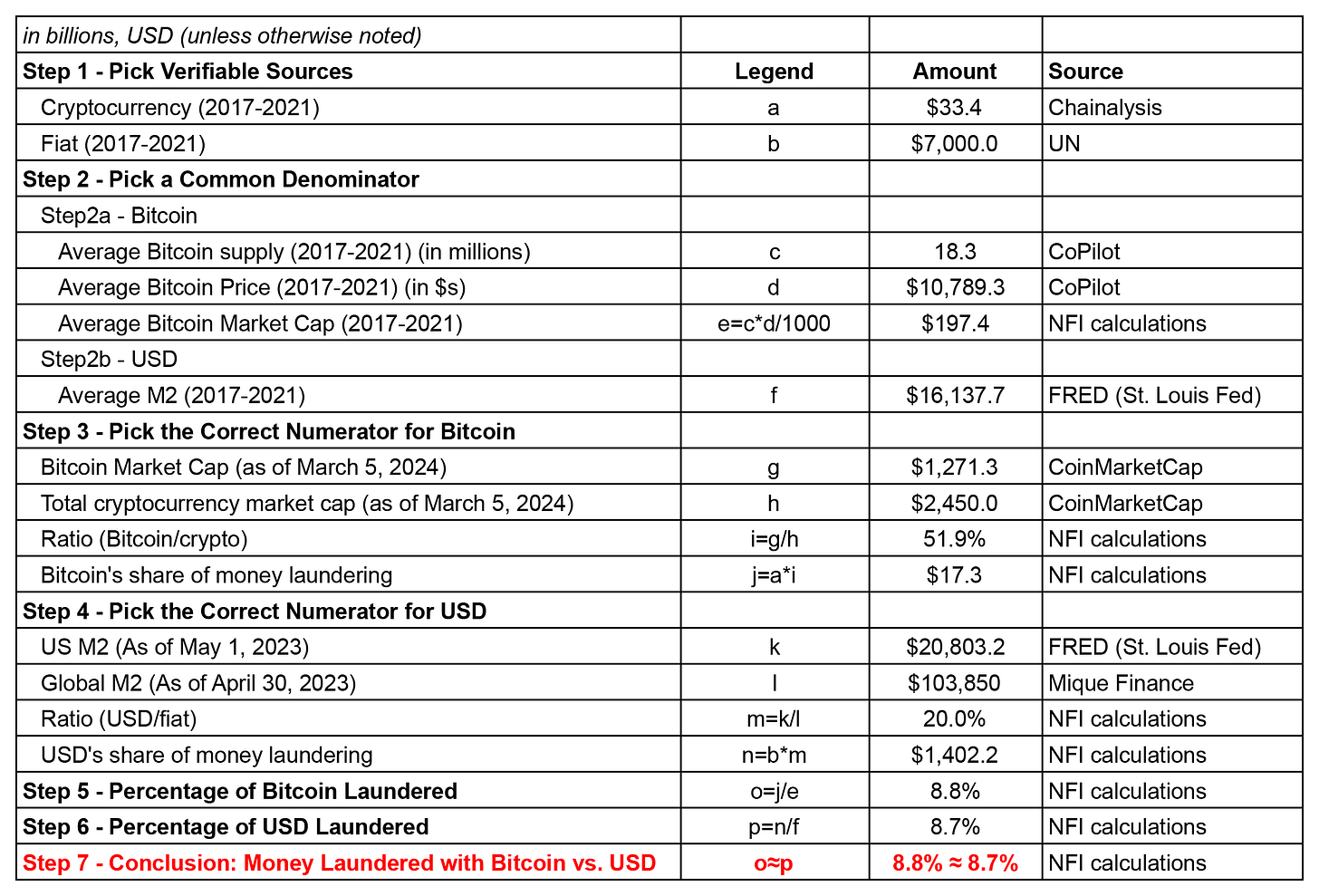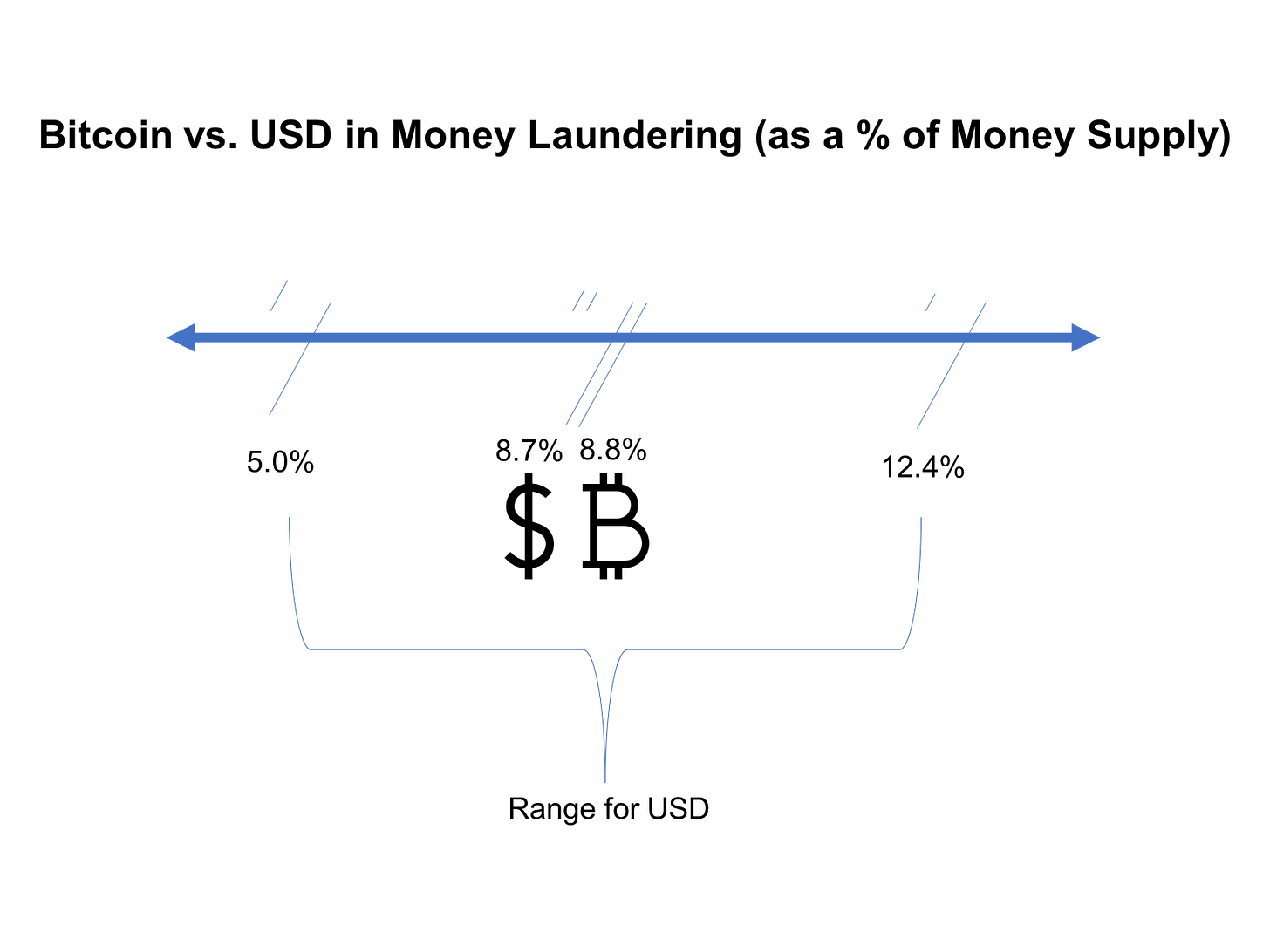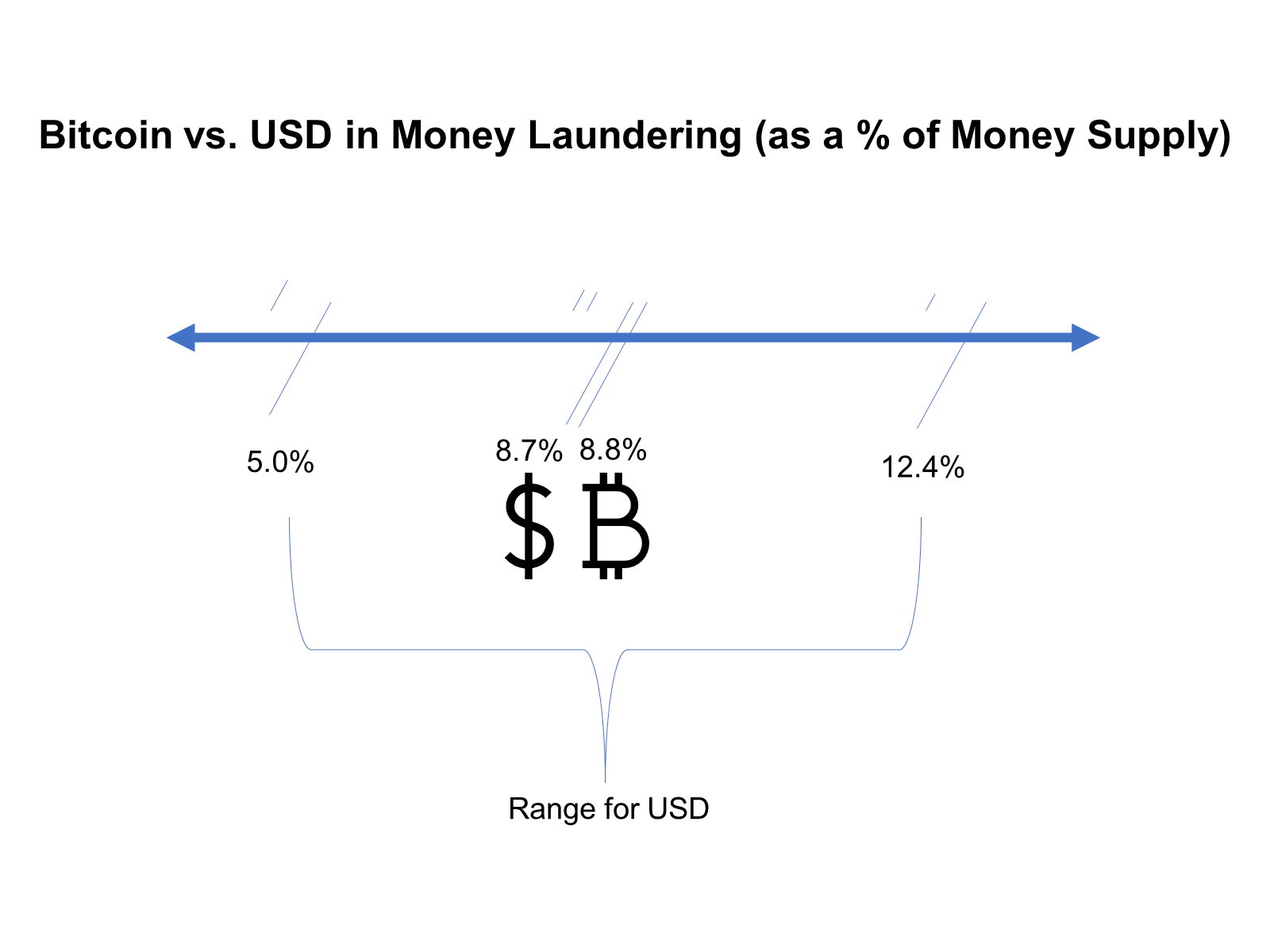 Thus, we conclude that the use of Bitcoin in money laundering is about the same as USD. Here is how we came to that conclusion: