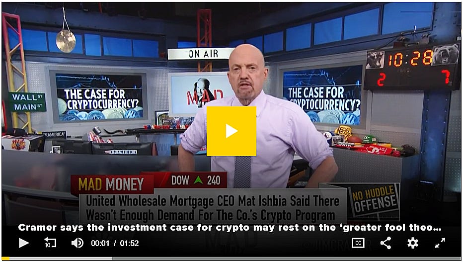 A bit frustrated, you now switch to Jim Cramer. Did he chime in on crypto? A few clicks, and yes, of course he has: