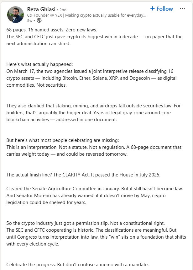 We agree that the SEC’s arguments were not the strongest. The agency sensed–correctly–that crypto is a minefield. But instead of addressing the core issue (that crypto is not an investment in the first place, which is the single most important disclosure), it tried to force crypto into the Howey framework. Howey does apply to crypto, but it needs refinement first (PDF). The SEC never did that work, so its litigation positions resembled a suit tailored for someone who was never measured.