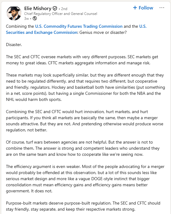 And we are far from the only ones raising concerns. Here is Elie Mishory, Chief Regulatory Officer and General Counsel, who left Kalshi to become the SEC point person for DOGE: