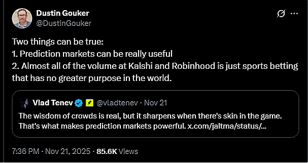 Some prediction markets are worthy and they should be permitted. At the same time, some are unworthy and should be prohibited. The policy answer, then, is not all-or-nothing, it lies somewhere in between. The volume, however, is much closer to one extreme than the middle: As Gouker often notes, volume is heavily skewed toward sports event contracts. Those are the contracts that should never have existed in the first place.