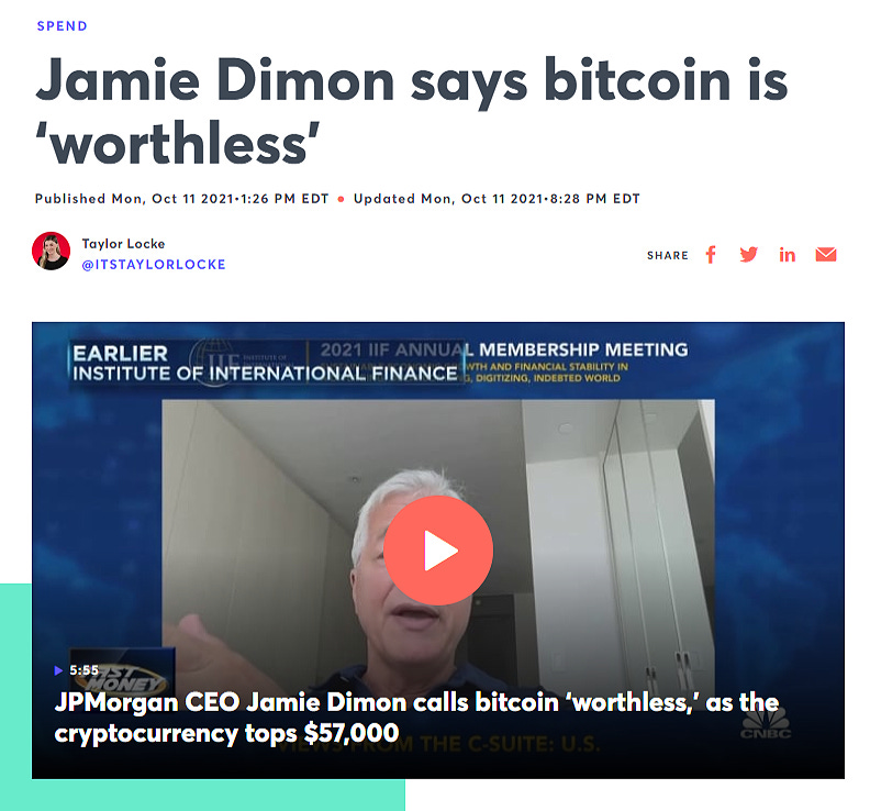 I personally think that Bitcoin is worthless. But … I don’t care. It makes no difference to me. I don’t think you should smoke cigarettes either… Ok, that’s Jamie, now JPMorgan. Our clients are adults. They disagree, that’s what makes markets. So if they want to have access to buy or sell Bitcoin, we can’t custody it, but we can give them legitimate, as-clean-as-possible access.